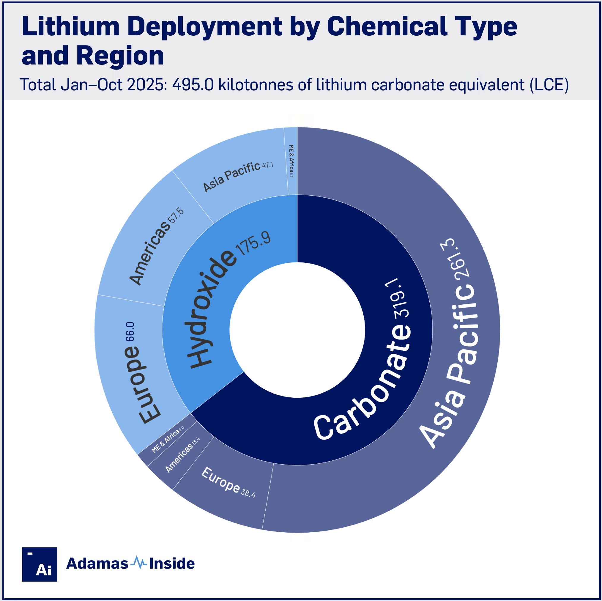 Of this total just under 65% or 319.2 kt was in the form of lithium carbonate whereas lithium hydroxide deployment made up 35% at 175.9 kt over the first 10 months of the year.