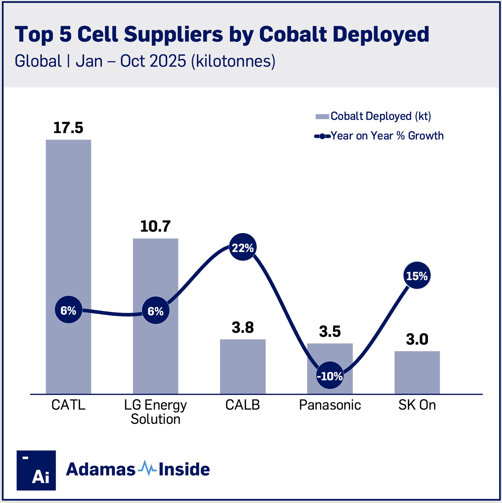 Rounding out the top five is SK On. The Korean cell supplier increased cobalt deployment to 3.0 kt, up 15% compared to last year. SK On’s batteries are fitted to among others Hyundai, Kia, Mercedes Benz and Ford models (including the soon to be discontinued F-150 Lightning pick up).